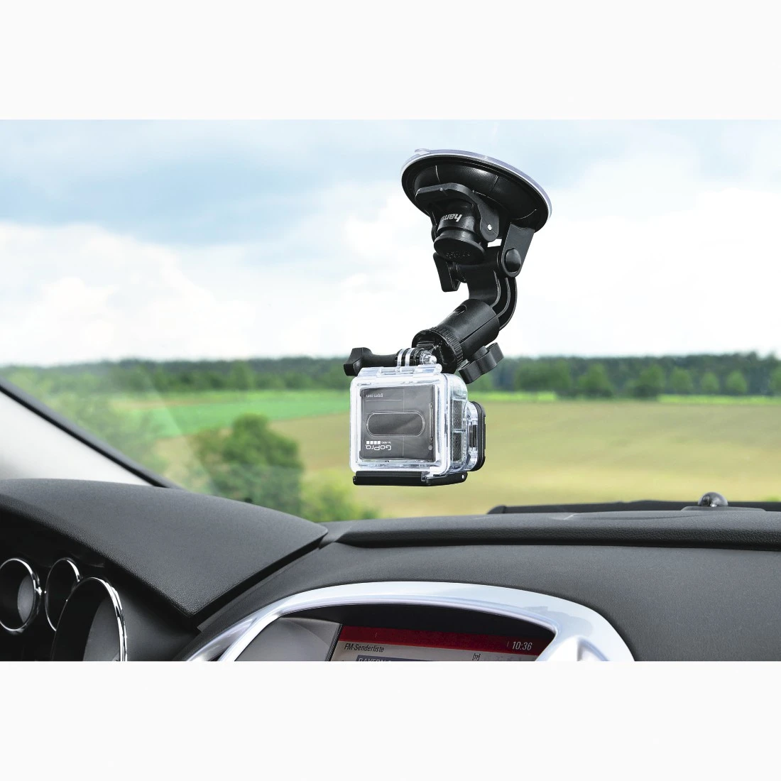 En raison des différentes profondeurs des filetages de trépieds dans les appareils photo et les caméras sportives le pied photo ventouse a été conçu de façon à ce que la profondeur du filetage soit ajustable. Veuillez d’abord tourner le disque en plastique tout en bas. La goupille filetée a un disque métallique avec un filetage à l’aide duquel vous pouvez ajuster la longueur désirée du filetage. Quand vous avez ajusté la longueur du filetage, veuillez visser le disque en plastique vers le haut jusqu’à ce qu’il soit situé tout près du disque métallique. Maintenant vous pouvez fixer votre appareil photo au pied photo.