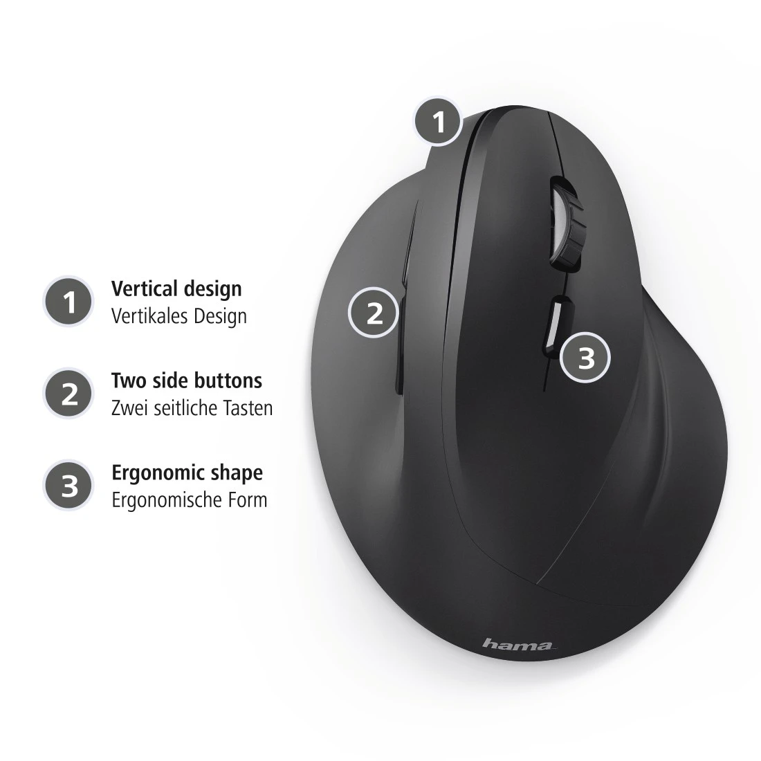 Onze verticale, ergonomische draadloze muis helpt je om je hand in de juiste houding te houden en voorkomt overbelasting en pijn in je schouders en polsen.